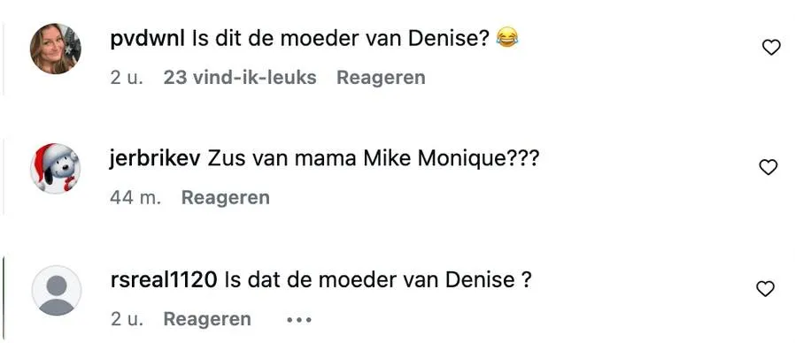 “Is dit de zus van Monique?” vraagt iemand zich hardop af. Een ander schrijft: “Ik zie nu al drama aankomen, dit voelt als Mama Mo 2.0.” En weer een ander gaat nog een stap verder: “Dit zou zó de moeder van Denise kunnen zijn.” De vergelijking met Denise – de voormalige vriendin van Mike Hansler – is snel gemaakt, zeker gezien de uitstraling, het accent en de manier van praten.