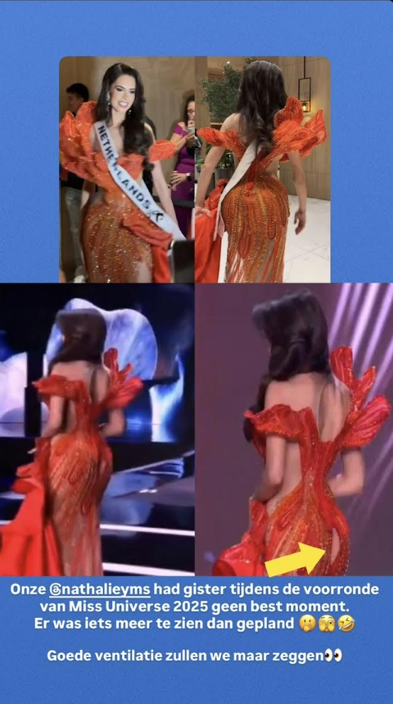 Iedereen die weleens een outfit heeft gehad die net iets te strak zat of op het verkeerde moment een naad verloor, weet hoe stressvol zo’n situatie kan zijn — zeker wanneer je op een wereldwijd podium staat. Voor Nathalie, die van nature ontspannen blijft, moet het desondanks een schrik zijn geweest.