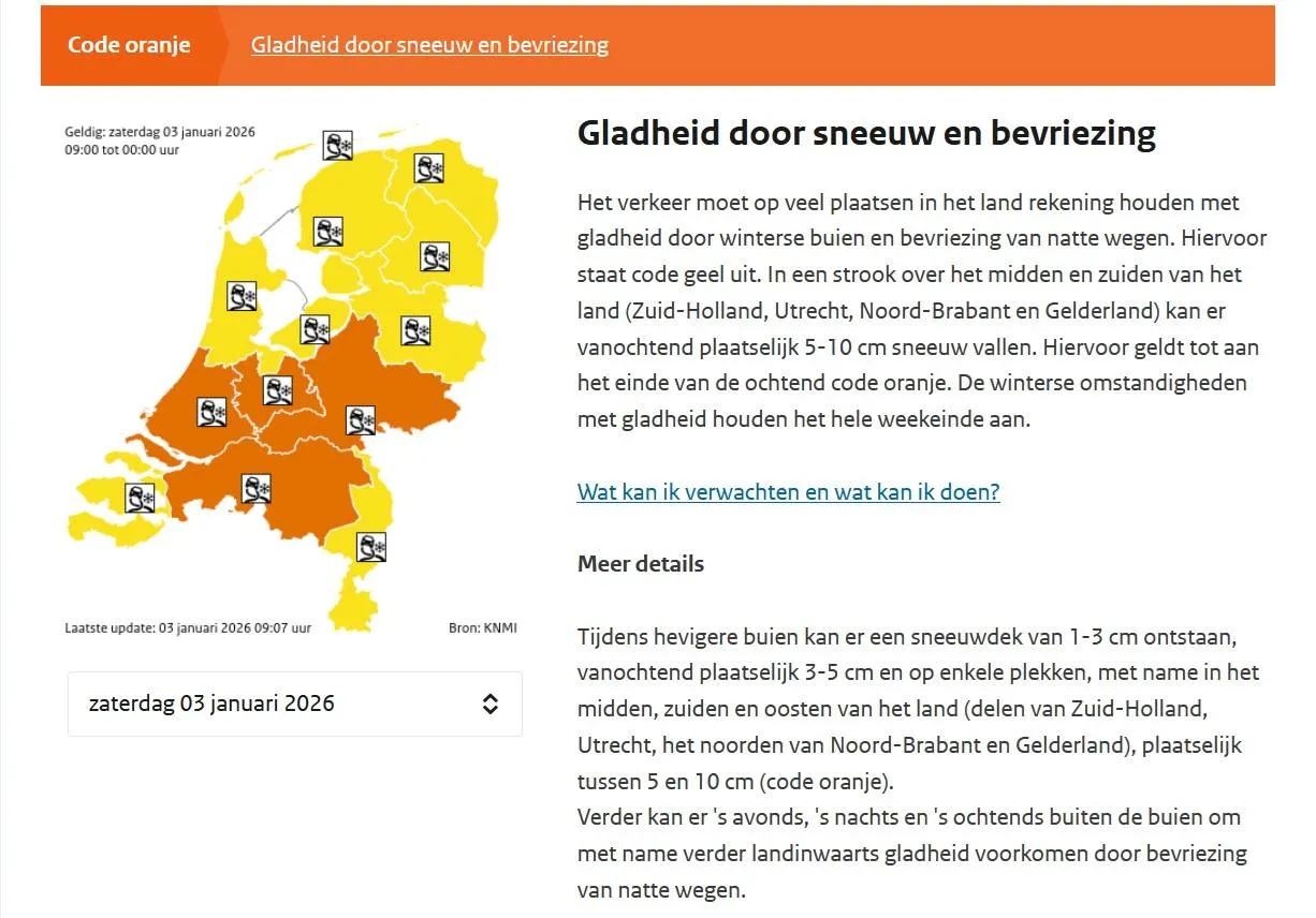 Het weer laat zich dit weekend van zijn meest winterse kant zien. Het KNMI heeft voor meerdere provincies code oranje afgegeven vanwege sneeuwbuien, bevriezing en verraderlijke omstandigheden op de weg. Volgens het weerinstituut staat ons een pittige dag te wachten, met lokaal flinke sneeuwhoeveelheden en een combinatie van kou, wind en gladheid die de situatie extra uitdagend maakt. Ook andere weerdiensten waarschuwen dat vooral het midden van het land rekening moet houden met snel veranderende omstandigheden.