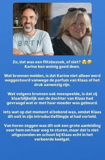 In de uitzending werd duidelijk gemaakt dat een ogenschijnlijk klein moment de doorslag gaf: Karine had op het toilet een parfumflesje gezien en zonder te vragen wat parfum opgespoten. Voor veel kijkers leek dat een overdreven reden om iemand weg te sturen, maar voor Klaas was het een duidelijke grensoverschrijding.