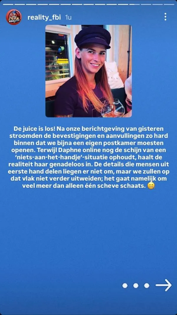 RealityFBI deelde op Instagram een uitgebreide toelichting, waarin het kanaal stelt dat Daphne online de indruk zou wekken dat er “niets aan de hand” is, terwijl de realiteit volgens hen anders zou zijn. Daarbij wordt gesproken over informatie “uit eerste hand”, maar zonder dat die informatie openbaar wordt gemaakt of verifieerbaar is.