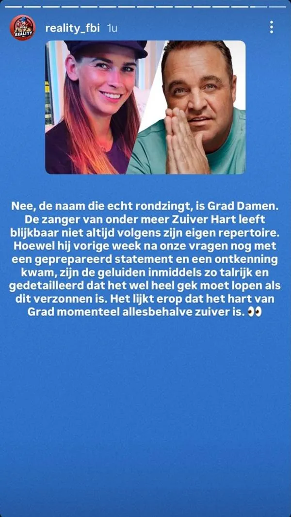 Volgens RealityFBI is Grad Damen vorige week benaderd met vragen over de geruchten. De zanger zou daarop hebben gereageerd met een korte verklaring waarin hij de beschuldigingen ontkent. Sindsdien zouden er volgens het kanaal meer meldingen zijn binnengekomen van mensen die het verhaal ondersteunen.