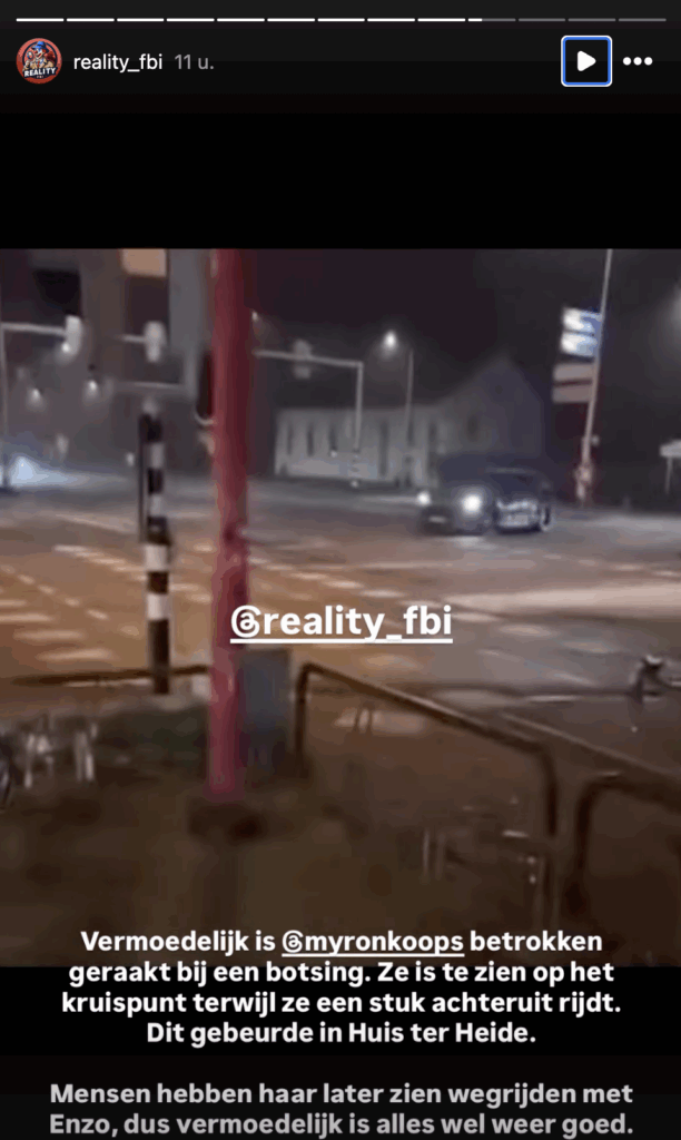 De vriendin van vlogger Enzo Knol, Myron Koops, is onlangs betrokken geweest bij een auto-ongeluk. Tijdens een livestream van Enzo werd het nieuws onverwacht bekendgemaakt, toen hij plotseling het bericht kreeg dat zijn vriendin en hun zoontje bij het incident aanwezig waren. Inmiddels hebben beiden laten weten dat het naar omstandigheden goed gaat.