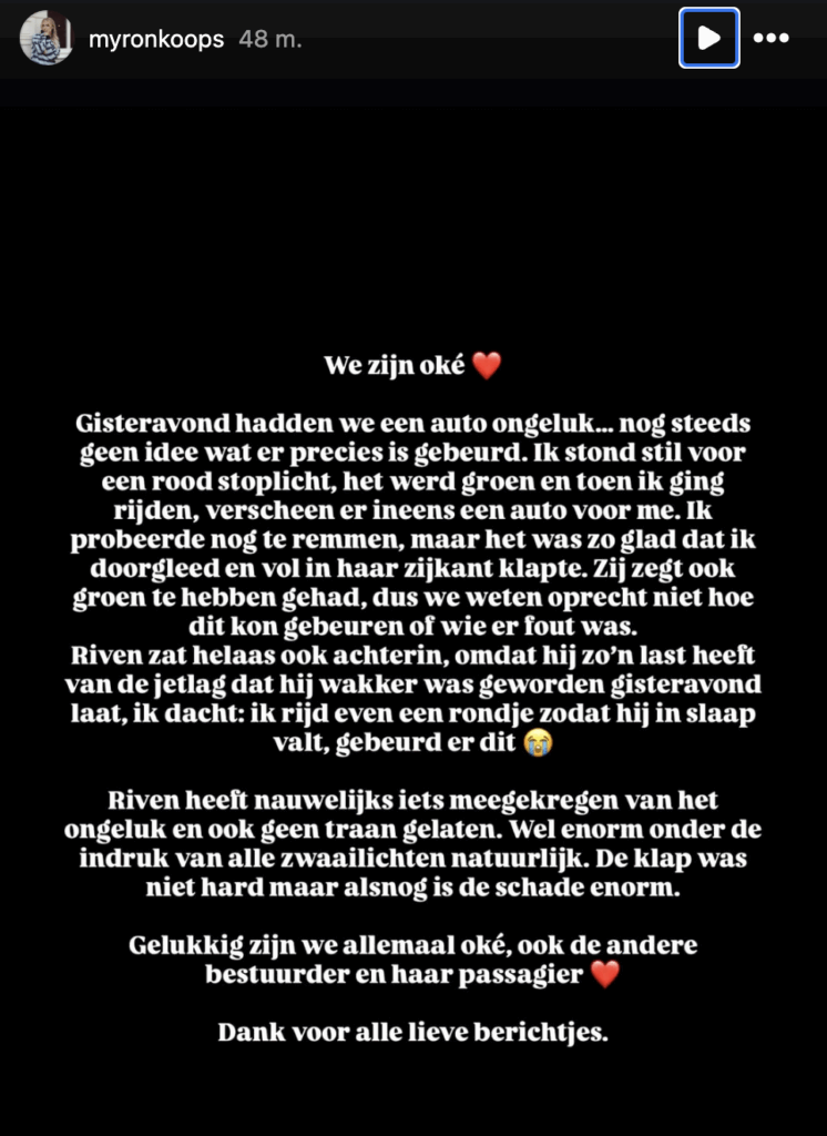 Het auto-ongeluk waarbij Myron Koops en haar zoontje betrokken waren, is gelukkig goed afgelopen. Hoewel de schade aan de auto aanzienlijk was, kwamen alle betrokkenen met de schrik vrij. Voor Enzo Knol en zijn gezin is dit vooral een herinnering aan hoe belangrijk alertheid en voorzichtigheid in het verkeer blijven – iets wat veel kijkers en volgers ongetwijfeld herkennen.